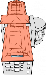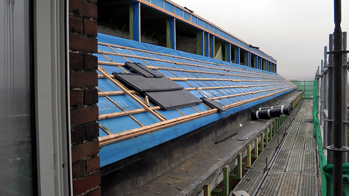 Selon la pente ; donc principalement à X° pour les versants d’origine et plate (2°) au-dessus des chiens assis, l’étanchéité à l’eau est gérée distinctement : à l’aide d’une sous-toiture au niveau des pans de toiture et à l’aide d’une membrane EPDM au niveau de la toiture plate.
