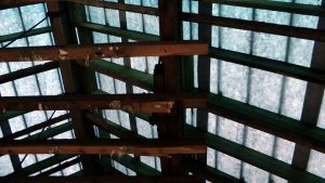 Sur cette photo de chantier, on peut apercevoir les éléments en bois entre lesquels les rouleaux de laine minérale vont être déployés. Les dalles en béton constituant une partie des pans de toiture sont autant que possible conservés. Néanmoins, la mise en œuvre d’une isolation continue et le « redécoupage » de la toiture pour y insérer des baies a nécessité la destruction d’une partie de ces dalles en béton.