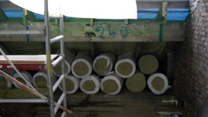 L’isolation thermique est réalisée en laine minérale se présentant sous forme de rouleaux épais de 22 cm. La conductivité thermique a une valeur U = 0,035 W/mK. Les rouleaux de laine minérale sont déployés dans la structure réalisée pour accueillir cet isolant. Celle-ci est réalisée avec des éléments en bois de 23 cm d’épaisseurs disposés à intervalles réguliers.