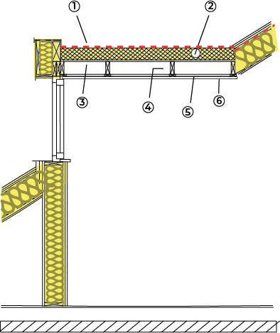 Compte tenu de la structure existante en béton (système mixte : une partie faite de poutres et poutrelles en béton et une autre partie faite de portiques en béton soutenant des dalles en béton qui constituent les pans de la toiture), le choix d’une isolation par l’extérieur s’est imposé. Cette isolation est envisagée dans ce cas-ci avec une couche de 22 cm de laine minérale posée au sein d’une ossature-bois de 23 cm. Il s’agit donc d’une isolation traditionnelle entre chevrons.