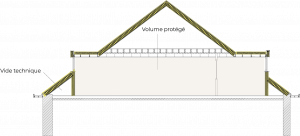 Ici, l’école a fait le choix d’isoler les versants de la toiture malgré qu’une partie du volume ne soit pas « habité ». Ce choix a été fait pour éviter les effets de verrouillage, dans une perspective de futurs aménagements possibles dans ce volume.