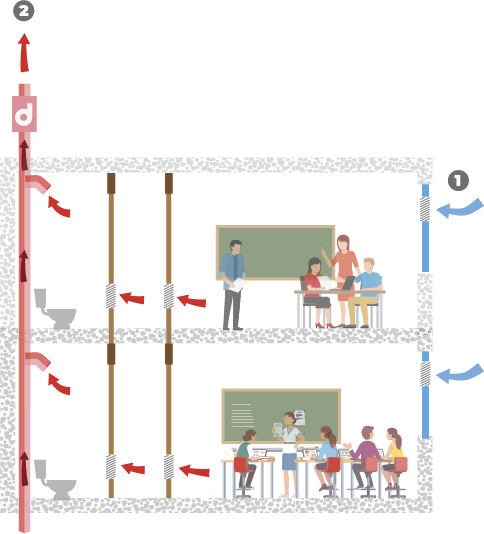 Dans une école du Brabant wallon, l’air neuf est introduit dans les classes par des ouvertures auto réglables et transféré sous les portes vers les sanitaires.