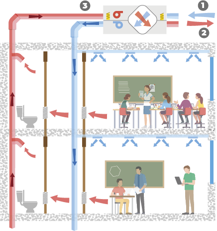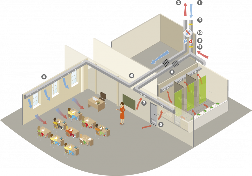 Seul des systèmes de ventilation mécanique à double flux permettent de respecter ces débits réglementaires. Grâce à une récupération de la chaleur des flux sortants, le système D limite l’inconfort et les besoins de chauffe dans les classes, le rendant particulièrement adapté à la démarche zéro-carbone.