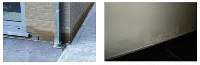 Photo de droite : Tache d’humidité dans l’enduit intérieur.