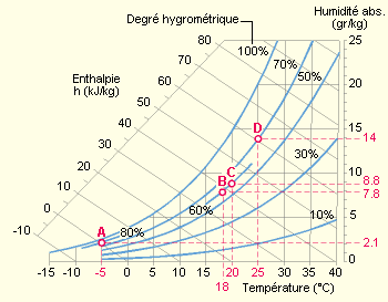 Le contenu énergétique de l’air est lié à la fois à sa température et à son humidité. En effet, la présence de vapeur d’eau dans l’air représente une forme d’énergie latente, égale à la quantité d’énergie nécessaire pour vaporiser ou condenser cette eau. La somme de l’énergie sensible (liée à la température) et de l’énergie latente (liée à l’humidité) est appelée enthalpie. Cette quantité d’énergie est importante, puisque la chaleur de vaporisation d’un litre d’eau est de 2 257 kJ/kg (à la pression atmosphérique et à 100 °C). Soit 5,4 fois plus que pour chauffer le litre d’eau de 0 à 100 °C ! Elle est cependant limitée par la quantité maximale de vapeur que l’air peut contenir, qui dépend de sa température.