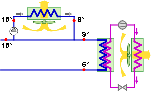 Lorsque la température extérieure descend sous les 8 à 10°C, on peut fabriquer de l’eau glacée sans utiliser le groupe frigorifique. L’eau peut-être directement refroidie par l’air extérieur. La machine frigorifique est alors mise à l’arrêt.