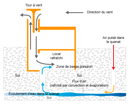 Le premier dispositif se trouve dans l’architecture vernaculaire de nombreuses cultures, mais fut particulièrement développé par les Perses. Ils combinaient des tours à vent (« bagdir ») avec locaux servant de glacières (« yakh-chal ») souvent reliées à un canal souterrain (« qanat »). Par cet ensemble de dispositifs, ils étaient capables de conserver des aliments et rafraîchir des bâtiments dans un climat particulièrement chaud. Marco-Polo, lors de son premier voyage en orient, se serait vu offrir des glaces en plein été !