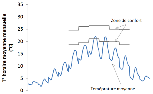 Les profils de températures moyennes à Uccle montrent que la température extérieure est généralement inférieure à la température de confort.
