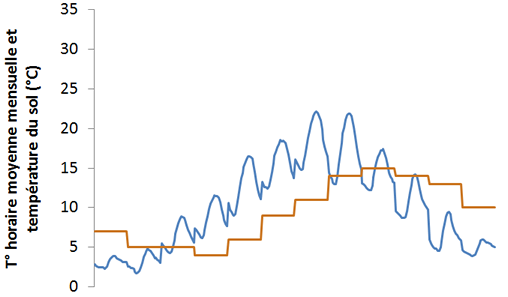 La température moyenne mensuelle est amortie et déphasée par rapport aux températures extérieures. Le sol présente donc un potentiel de rafraichissement particulièrement intéressant au printemps et en été, lorsque la température extérieure est plus élevée.