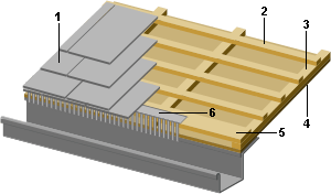 > Des voliges sont fixées entre ou sur les chevrons ou fermettes avec découpes éventuelles de ces derniers. Celles-ci vont servir de support à la gouttière.