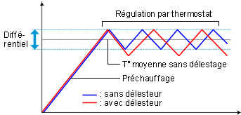 Évolution de la température dans un appareil de cuisson avec ou sans délestage : le délesteur ne peut jamais couper l’appareil avant qu’il n’atteigne la température de coupure de la résistance, faute de quoi, la température moyenne chuterait trop fort.