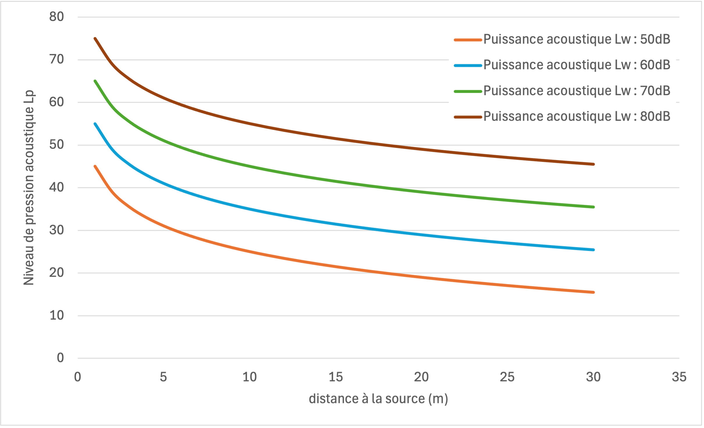 - respecter une distance de suffisante avec les habitations voisines. Pour comprendre l'importance de ce dernier point, il est important de réaliser que la pression acoustique diminue de 6 dB (soit une perception divisée par 4) pour chaque doublement de la distance à la source. Ainsi, si la pression acoustique est de 70 dB à 1 m de la source, il faudra un peu moins de 20m pour atteindre le seuil de 40 dB.