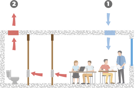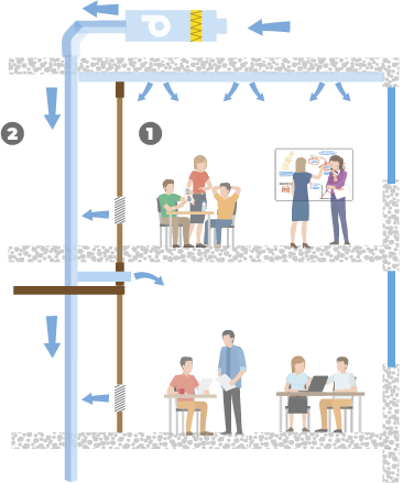 Pulsion mécanique dans les bureaux soit via le faux plafond des bureaux,