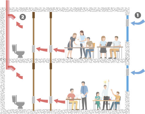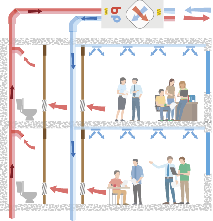 Les circuits d’extraction (conduits et ventilateurs) sont dans la plupart des cas communs à plusieurs niveaux. Ils sont généralement conçus suivant le principe du « parapluie ». Les conduits verticaux empruntent les gaines techniques également verticales et les conduits horizontaux passent dans l’épaisseur des faux plafonds. Ces ensembles desservent à chaque niveau une ou plusieurs zones sanitaires. Pour peu que l’extraction d’air soit limitée aux zones sanitaires (pas d’extraction complémentaire dans les couloirs ou certains locaux spécifiques à des fins d’équilibrage), ce réseau horizontal restera limité en ampleur.