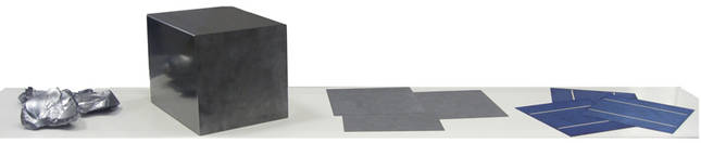 Le refroidissement du silicium en fusion est effectué dans des creusets parallélépipédiques à fond plat. Par cette technique, des cristaux orientés de manière irrégulière se forment. Cela donne l’aspect caractéristique de ces cellules bleutées présentant des motifs générés par les cristaux.