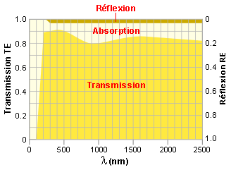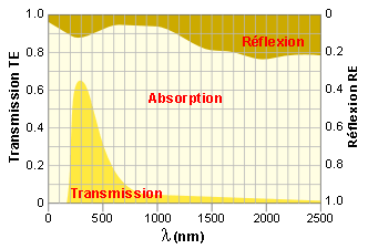 | Exemple : Les figures suivantes illustrent le principe ci-dessus en comparant les courbes de transmission du spectre solaire à travers un vitrage clair, un vitrage réfléchissant gris et un vitrage réfléchissant argenté.