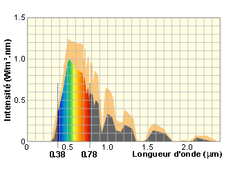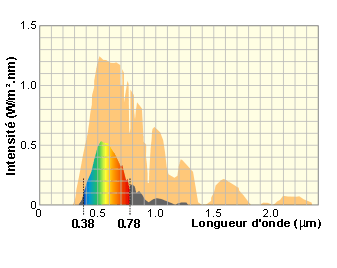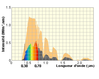 Spectre solaire. Ainsi, le facteur solaire ne peut être inférieur à la moitié de la transmission lumineuse; cela correspond à la zone supérieure rouge du graphique ci-dessous, qu’il n’est donc pas possible d’atteindre.