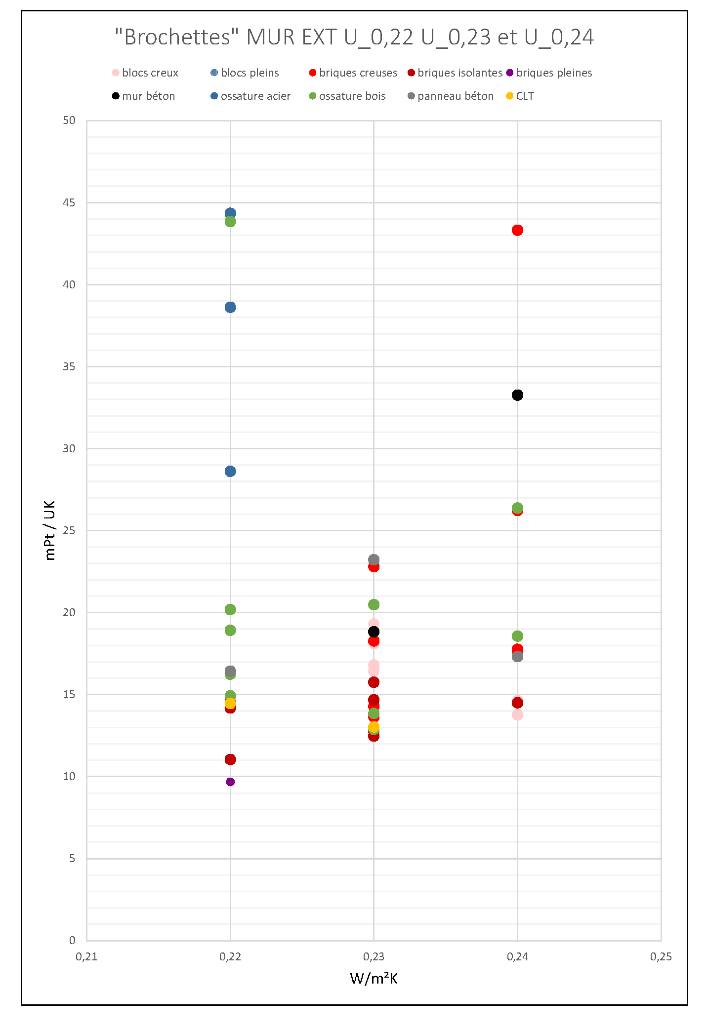 Le graphique ci-dessous présente un zoom sur quelques « brochettes » d’éléments tirées de la figure précédente, constituées d’empilements d’éléments autour des valeurs U suivantes: 0.22 W/m²K, 0.23 W/m²K et 0.24 W/m²K.
