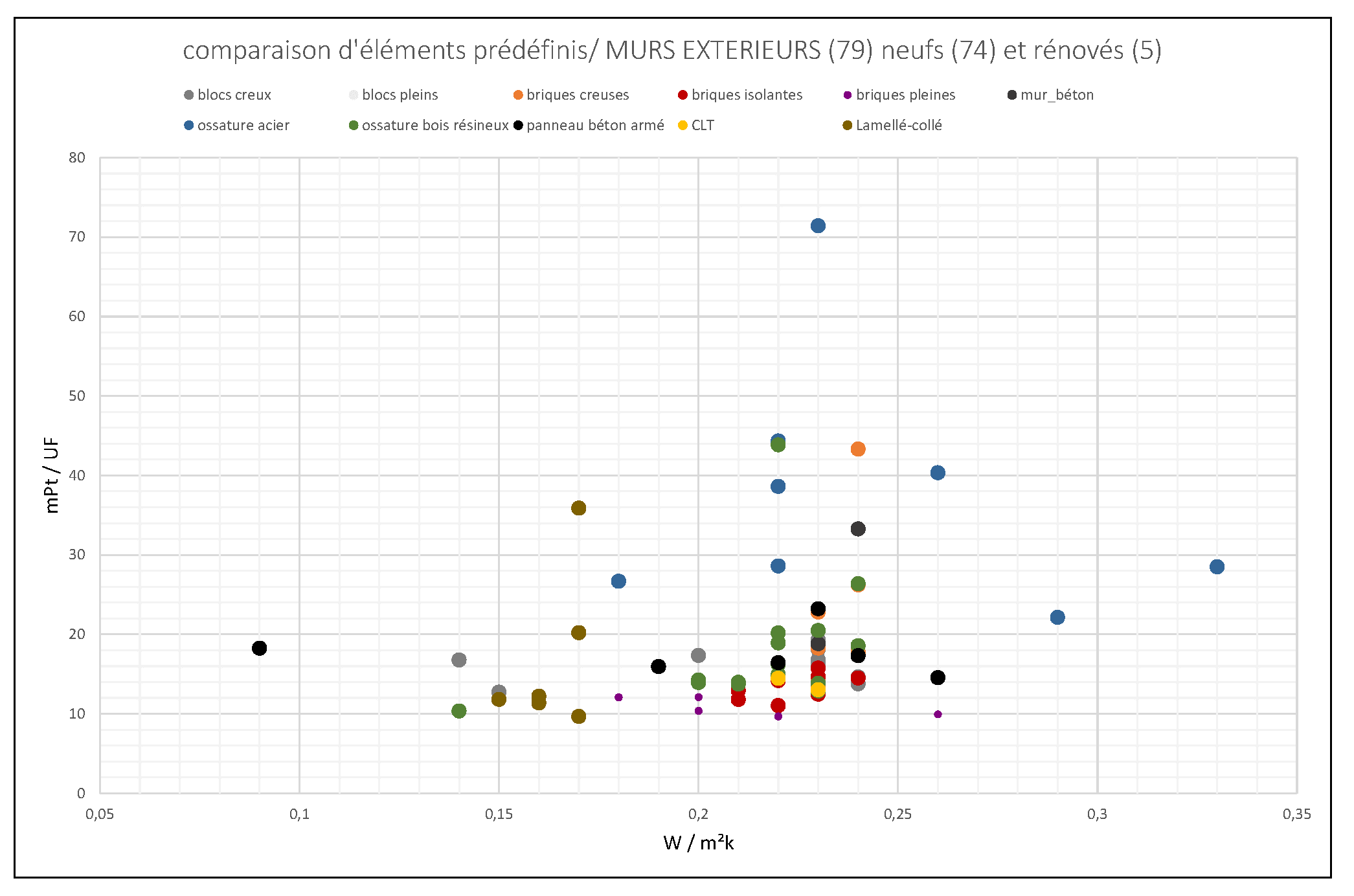 Le graphique ci-dessous représente l’ensemble des murs extérieures (79) répertoriés dans la bibliothèque TOTEM. En abscisse sont reprises les valeurs U (W/m2K) et en ordonnée le score agrégé de performance environnementale en millipoints par unité fonctionnelle de chaque complexe de paroi.