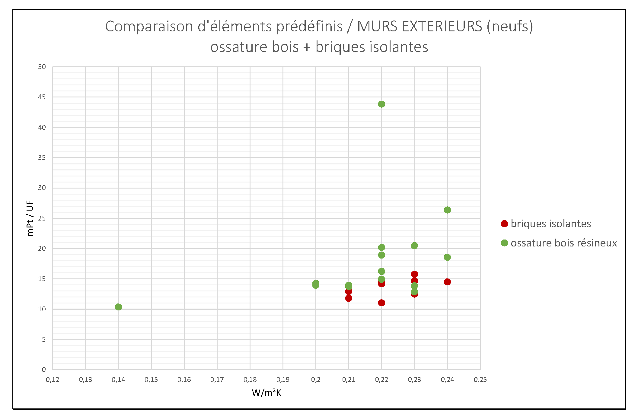 Le meilleur élément de la figure est ce point mauve apparaissant à la base de la « brochette » 0.22 W/m²K). Il s’agit d’une paroi de briques pleines en terre cuite « Reno ». Cela veut dire que certains composants de cet élément n’ont pas le même statut que celui de la majorité des éléments prédéfinis : les phases de production et chantier ne sont pas considérées pour ceux-ci. C’est donc une situation particulière.